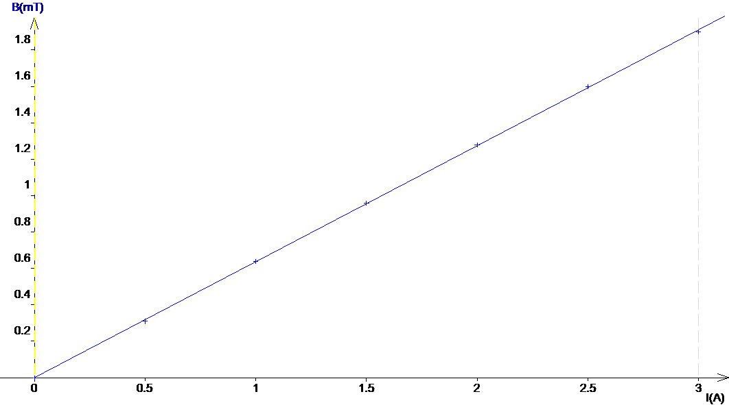 courbe d’évolution du champ magnétique B = f(I). Echelles : 5 cm pour 1A